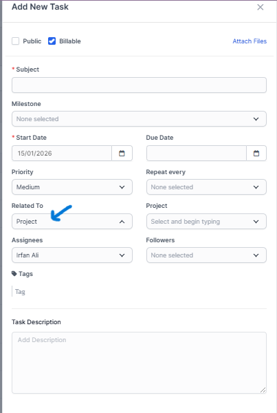 After you select the feature where the task will be linked on the right side a dropdown will be shown to select specific eq. project.