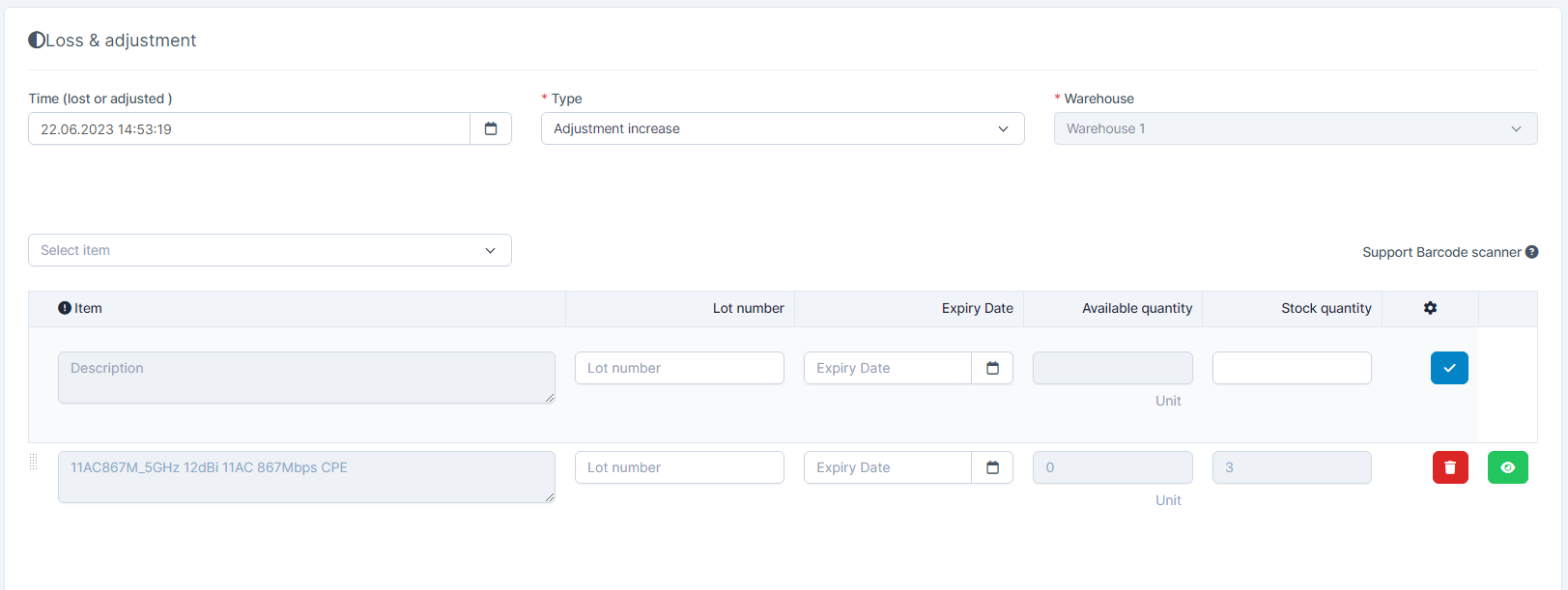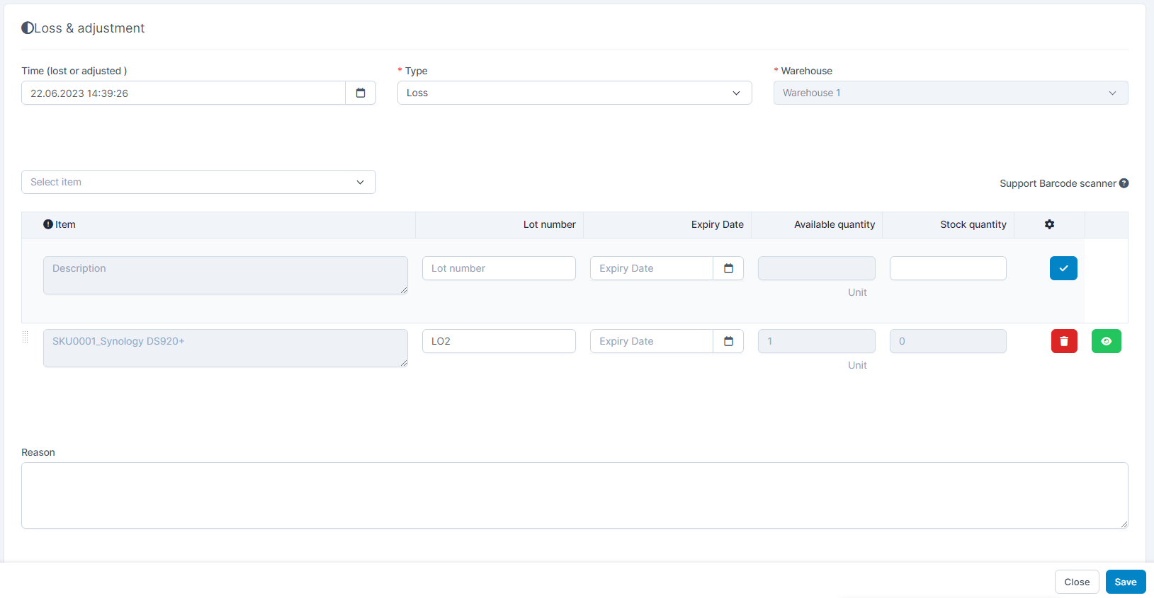 - Stock quantity: Enter the quantity that is lost or adjusted (based on type selected).