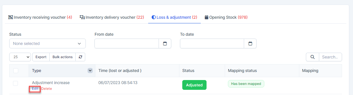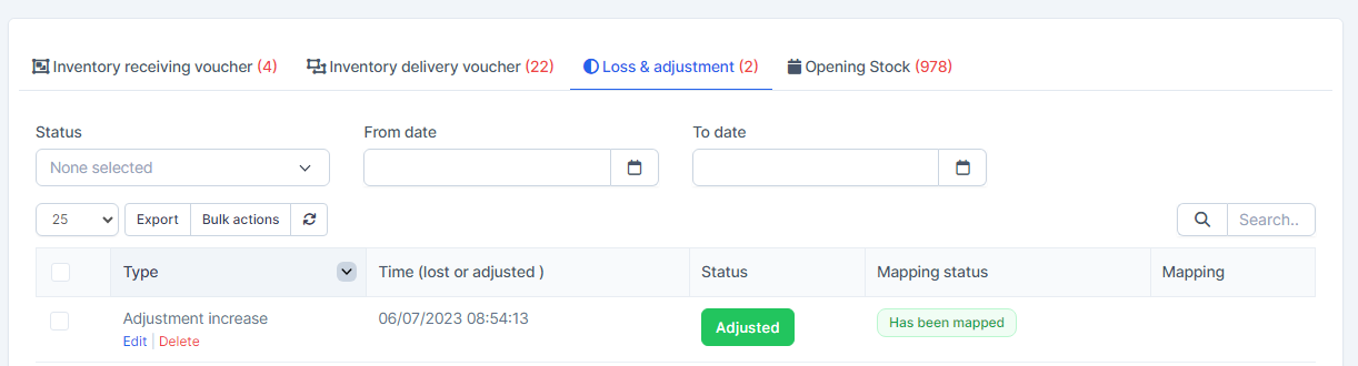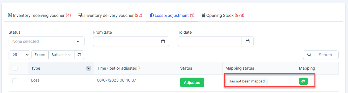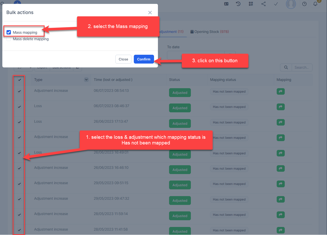 - Step 2. Go to the Transactions menu -> Inventory -> Loss & adjustment-> Select the loss & adjustment which mapping status is Has not been mapped -> click on the Bulk actions -> select the Mass mapping -> click on the Confirm button.