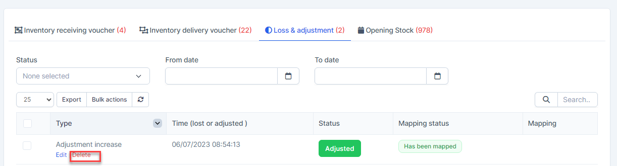 - Step 1. Go to the Transactions menu -> Inventory -> Loss & adjustment -> Select the Loss & adjustment which mapping status is Has been mapped -> click on the Bulk actions -> select the Mass delete mapping -> click on the Confirm button