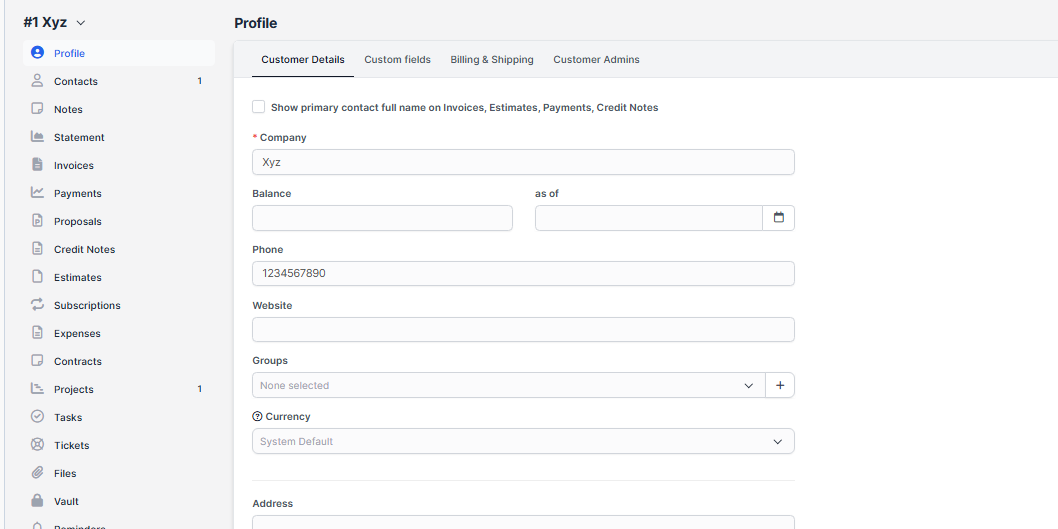 Step 2: After filling all the details , you can see all other options related to the customer like contact, notes, invoices, projects,etc.