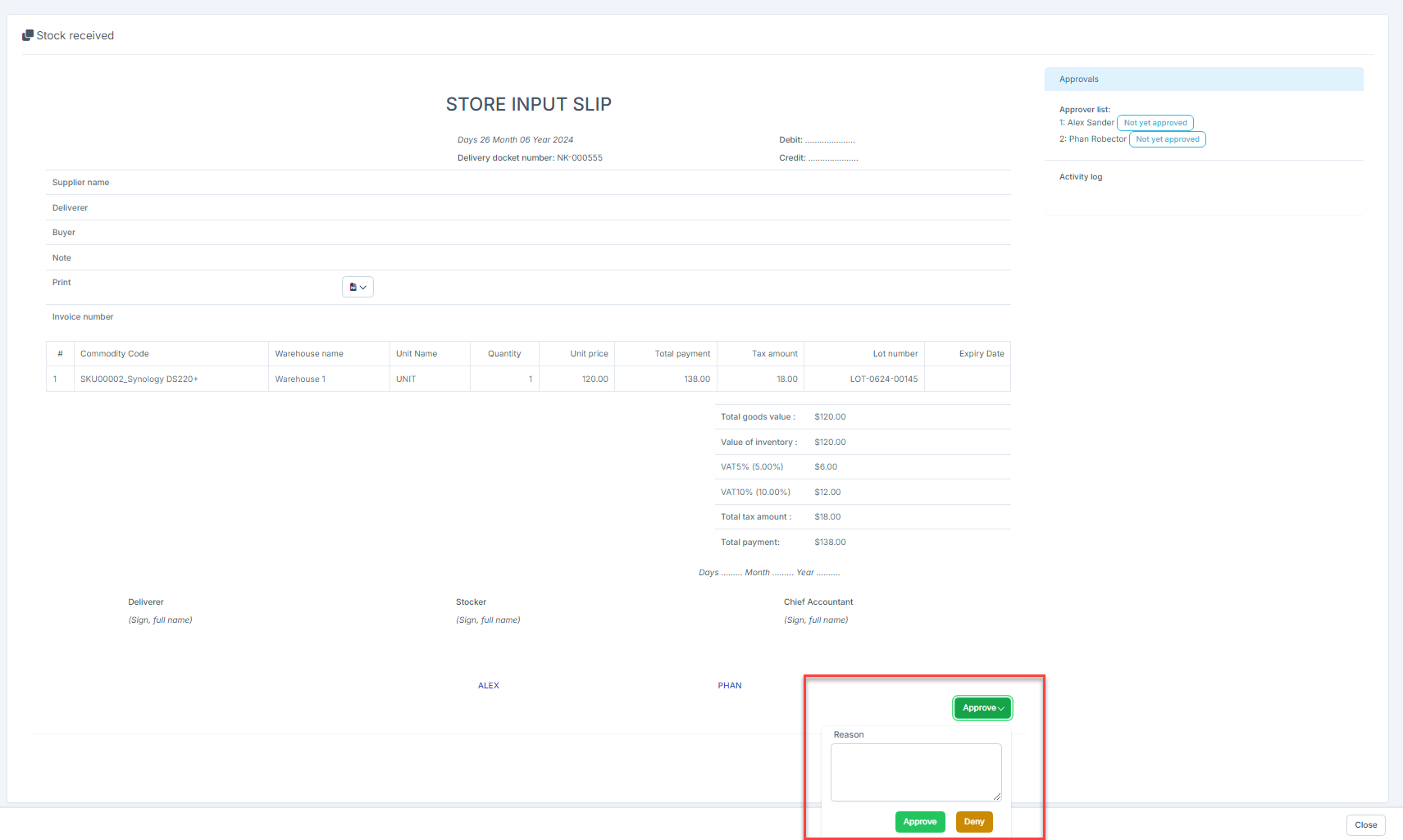 5. One of them logs in and selects Approve / Reject, then the request changes to APPROVED / REJECTED status and the others can no longer approve this transaction.