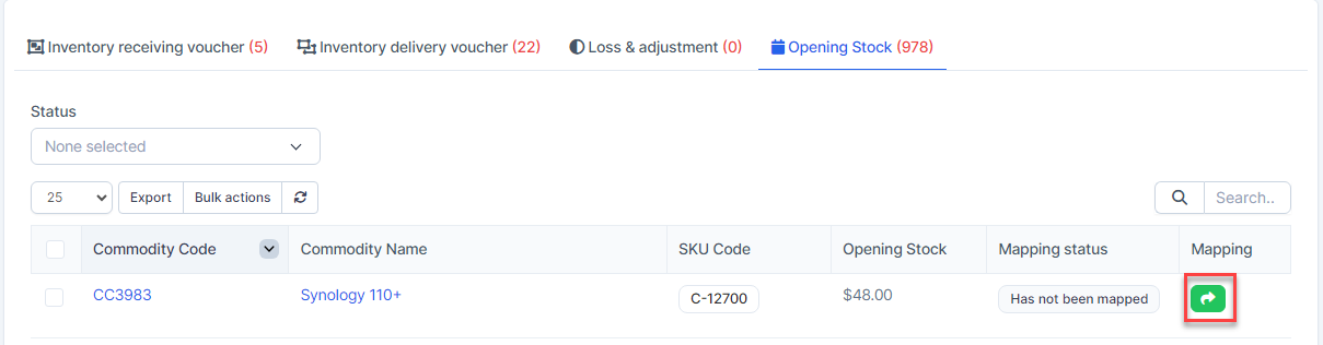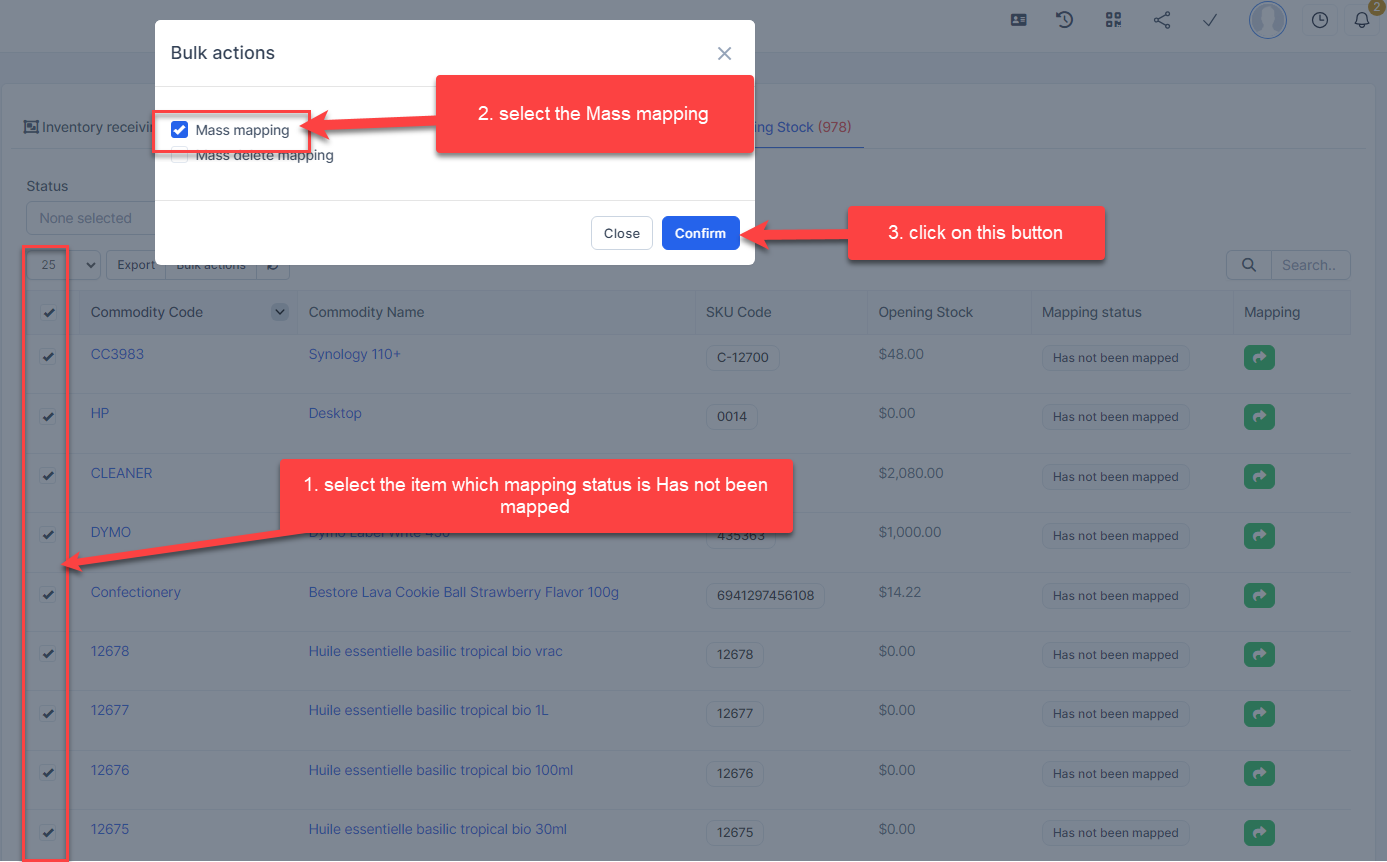 - Step 2. Go to the Transactions menu -> Inventory -> Opening Stock -> Select the opening stock of items which mapping status is Has not been mapped -> click on the Bulk actions -> select the Mass mapping -> click on the Confirm button.