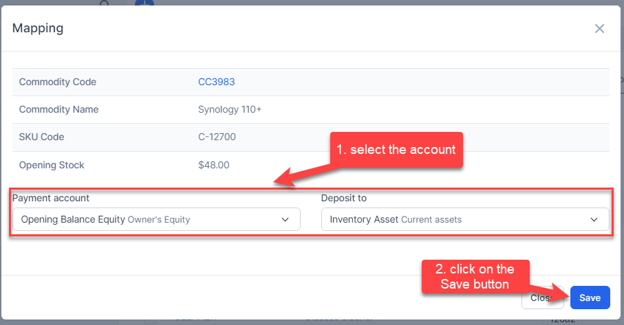 - Step 1. Enable the Opening Stock mapping setup and select the payment account and deposit to -> Click on the Save button