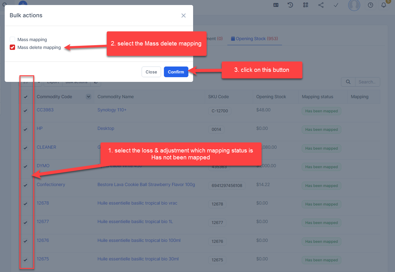 - Step 1. Go to the Transactions menu -> Inventory -> Opening Stock -> Select the opening stock of items which mapping status is Has been mapped -> click on the Bulk actions -> select the Mass delete mapping -> click on the Confirm button