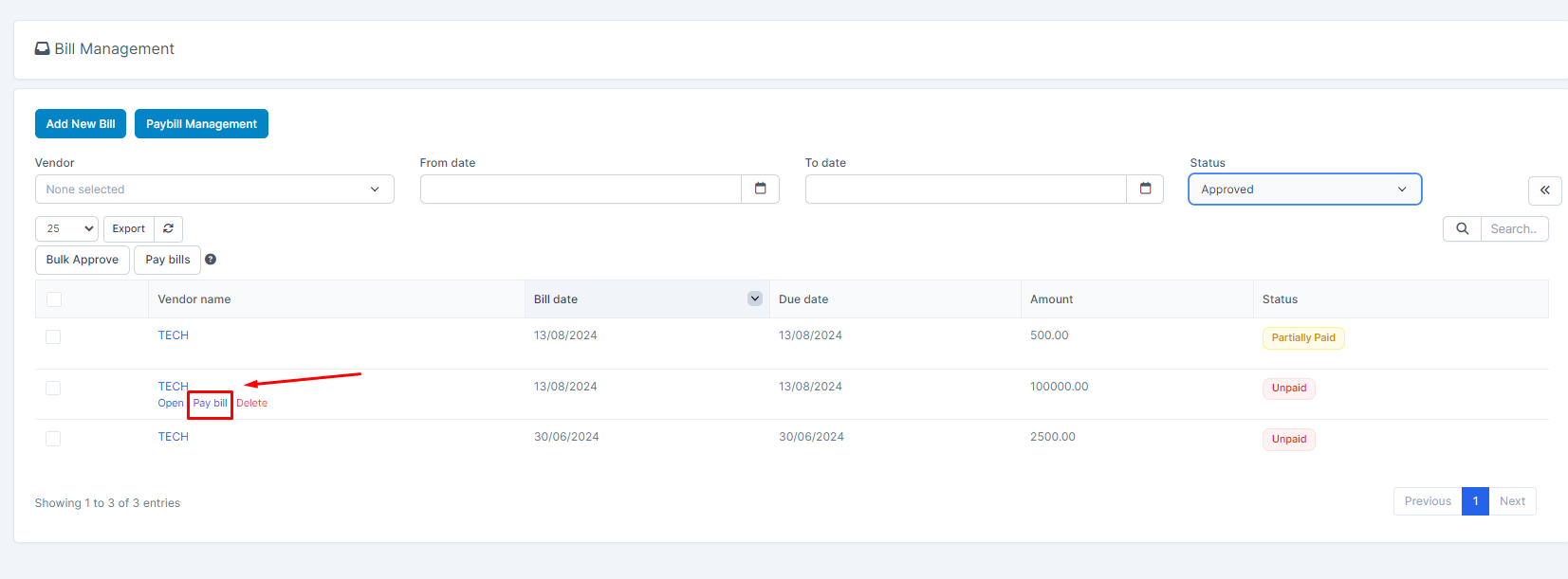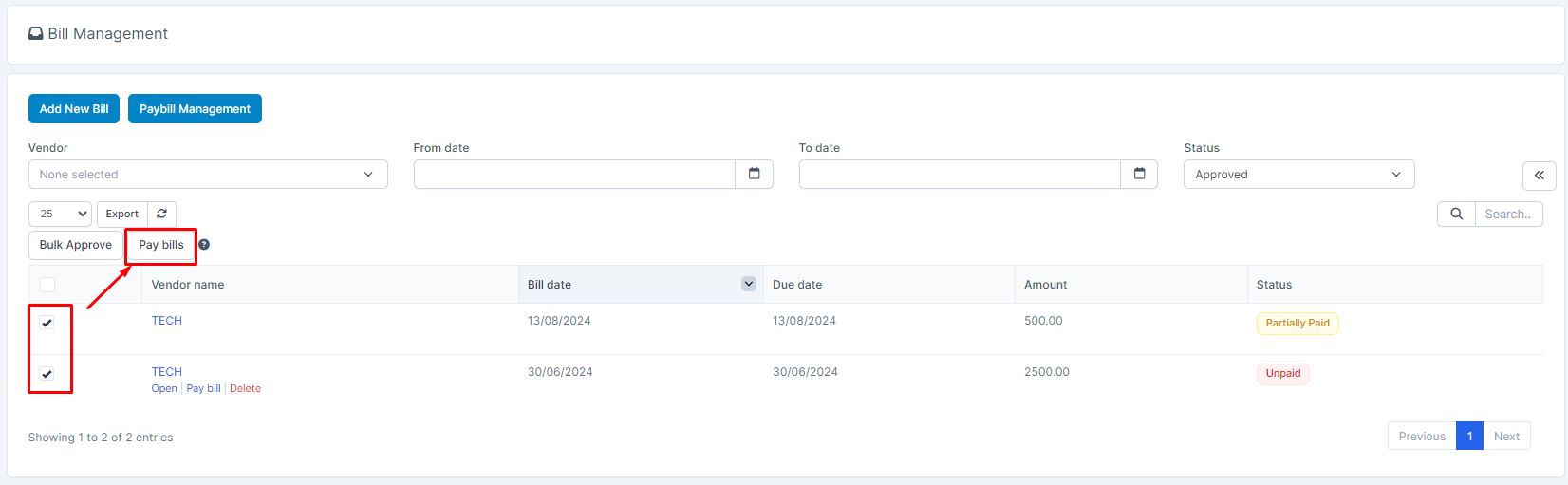 - Step 1: Step 1: Go to the Bills and filter status by Approved