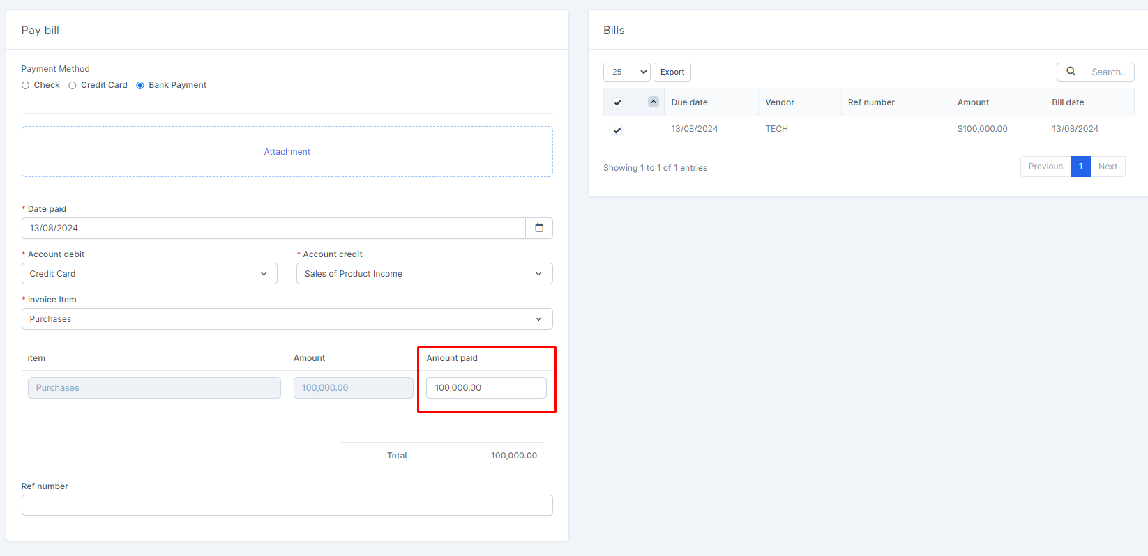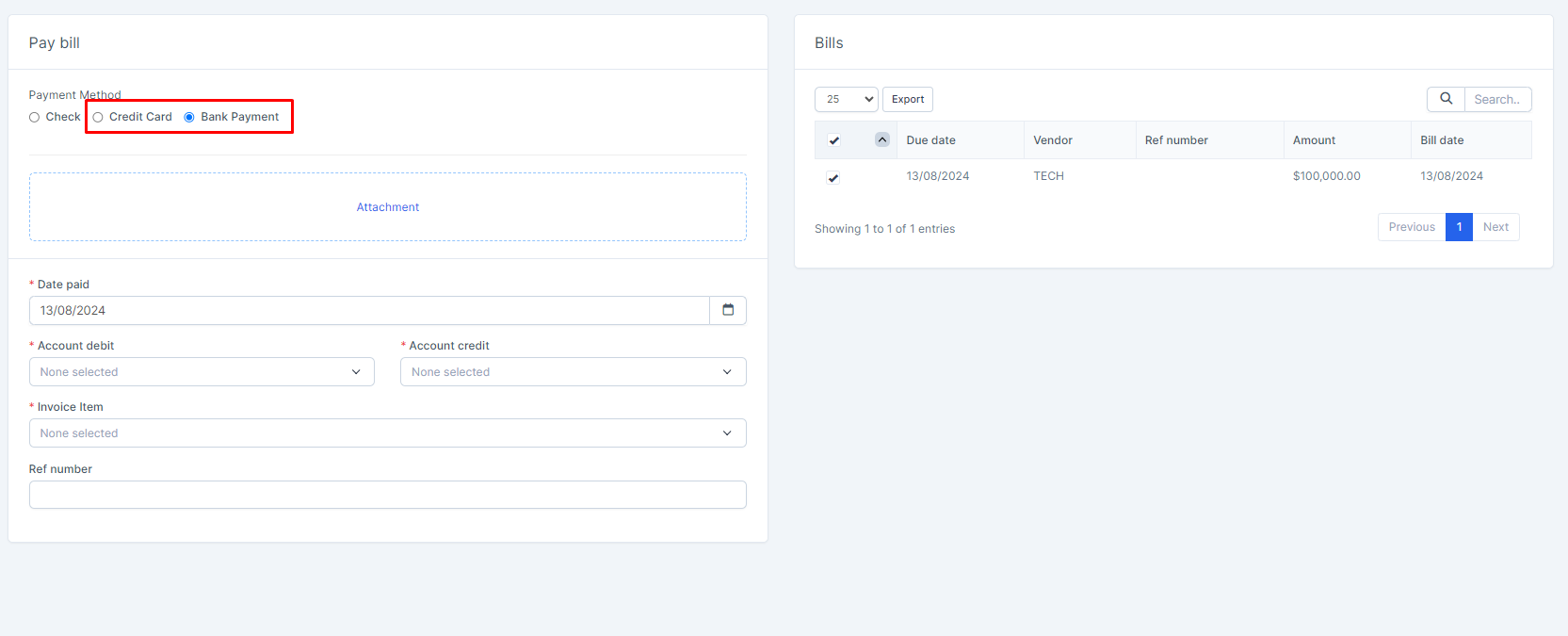 - Step 3. On the bill payment form, choose either Bank Payment and Credit Card. Verify the information is correct, such as the Payee, Date paid, Debit/Credit account fields, invoice item field. Make any changes if needed.. With payment method is Check, you can see details at https://wpscrm.com/knowledge-base/article/pay-bill-with-bank-payment-or-credit-card