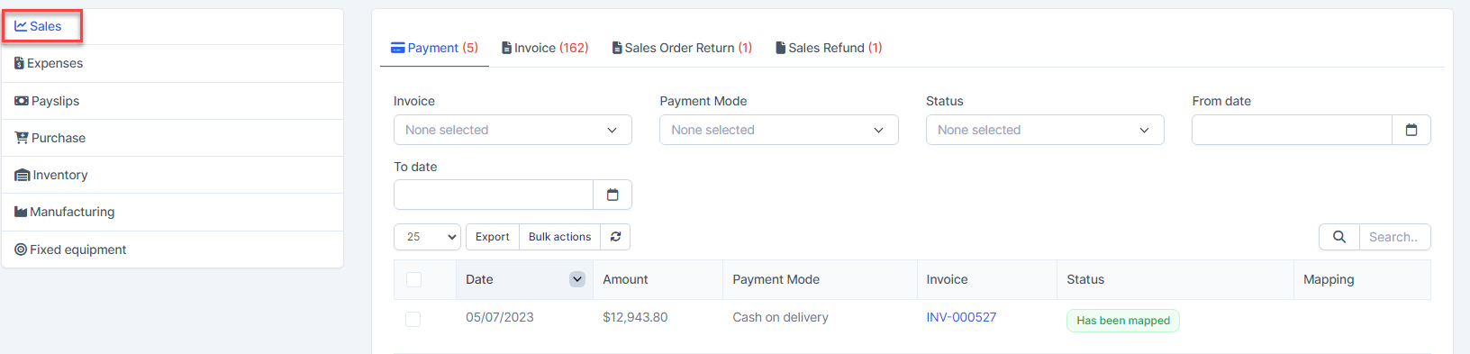 After the payment is created successfully, the payment is automatically mapped, you can check the payment is mapped or not at Transactions menu -> Sales -> Payment