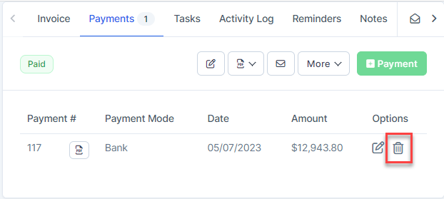 Go to the invoice page detail -> Select the Payments tab -> click on the Delete button