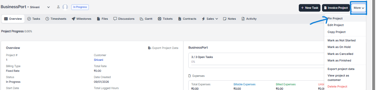 To pin a project from the main menu navigate to Project and open the project you want to open. On the top right side there is an Action button, click it and then click on Pin Project dropdown link.