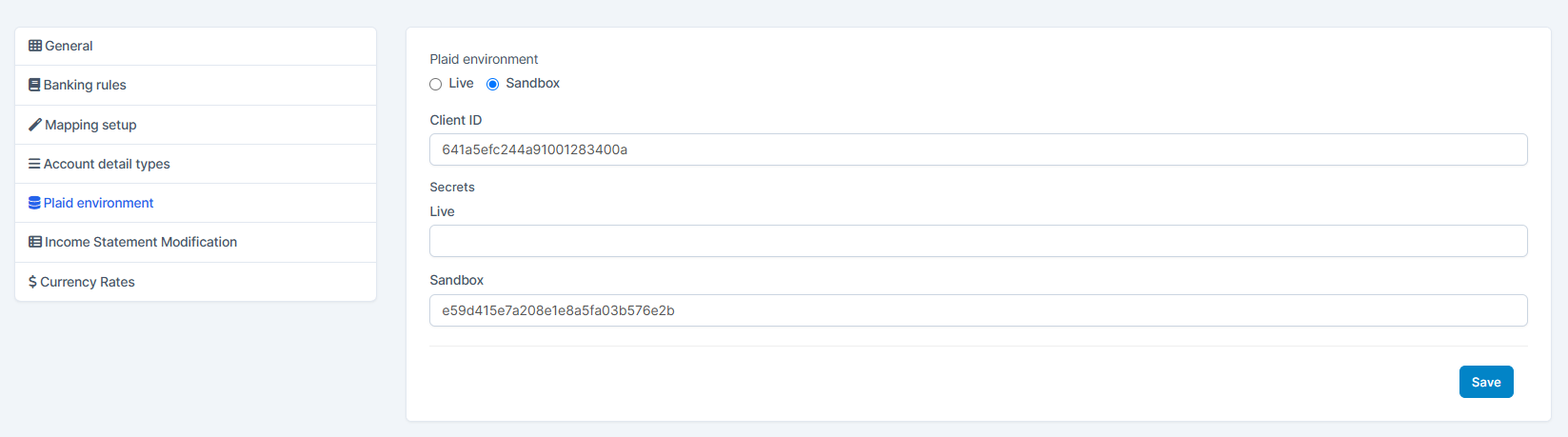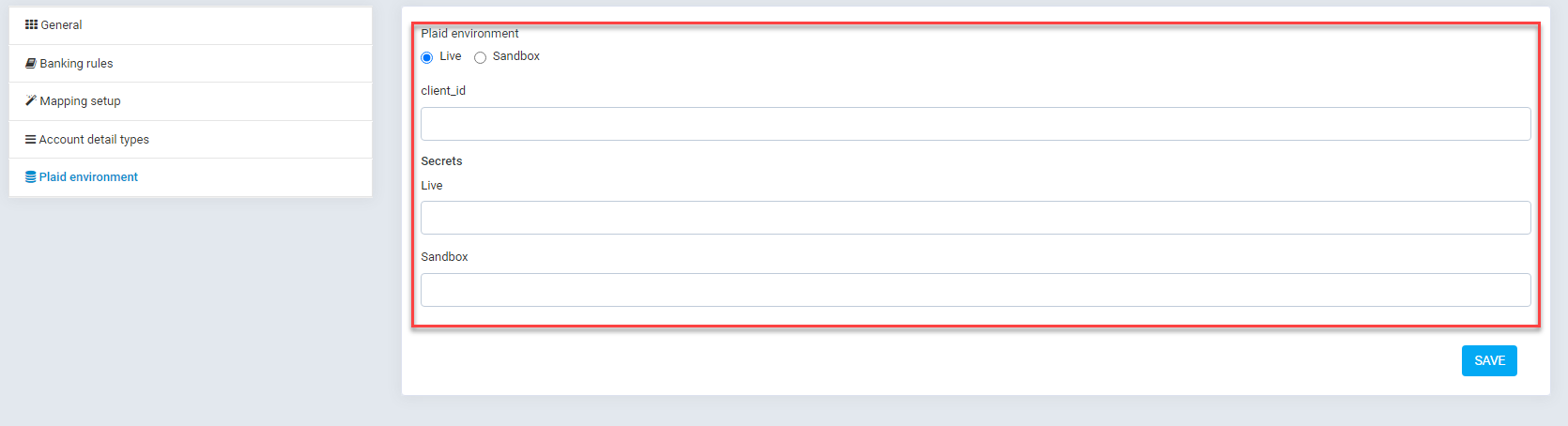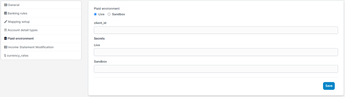 In your system's left sidebar, go to Accounting → Settings → Plaid environment → choose the environment: select either Sanbox or Live