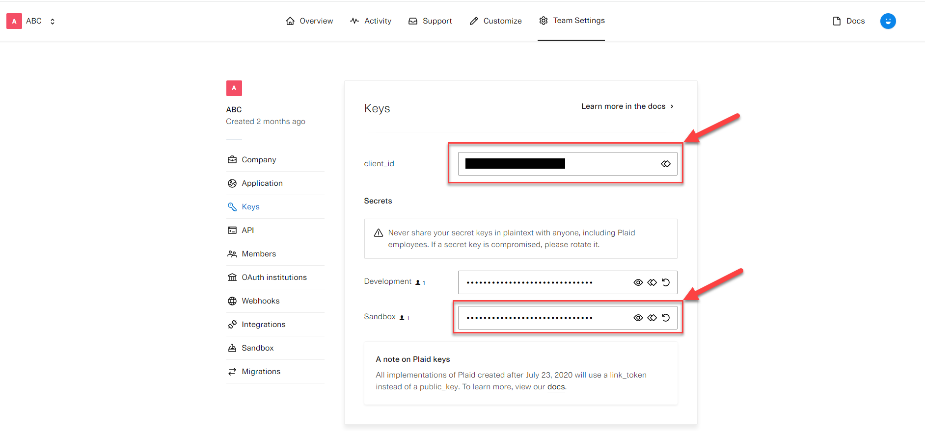 - After registration, navigate to Team settings -> Keys to obtain your client_id and secrets for both Sandbox and Live environments.
