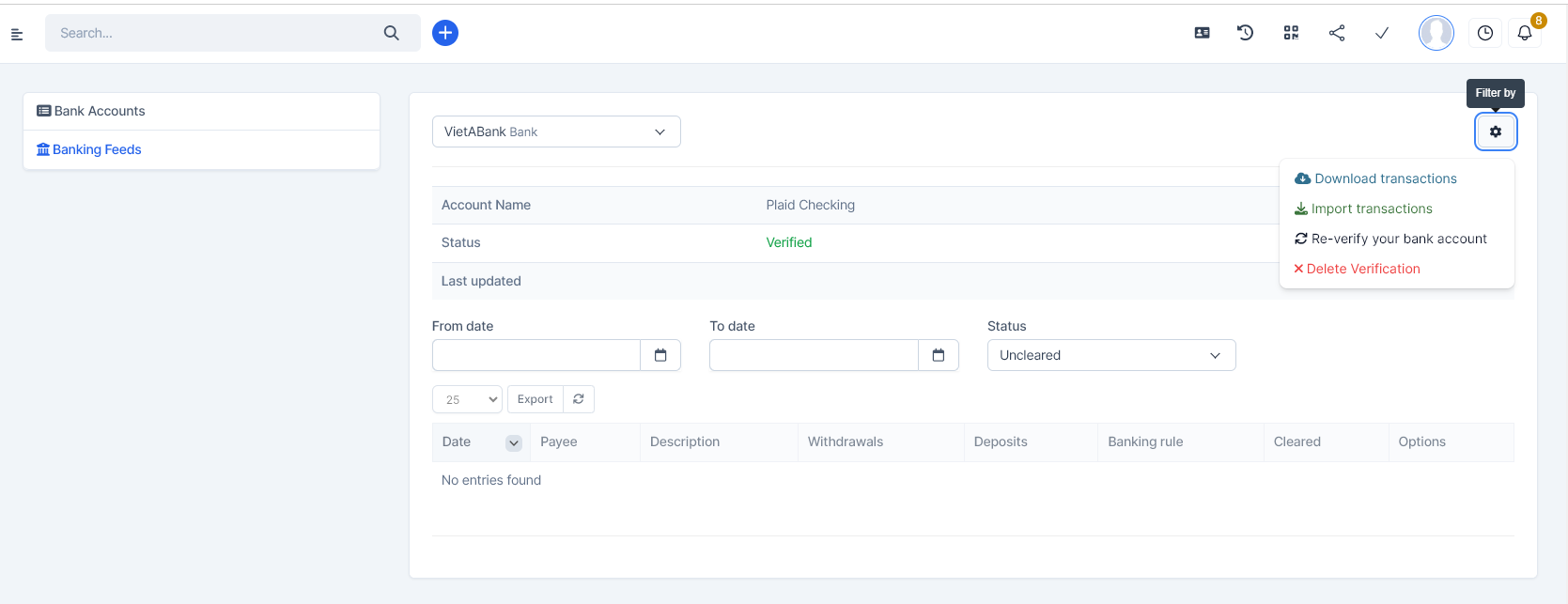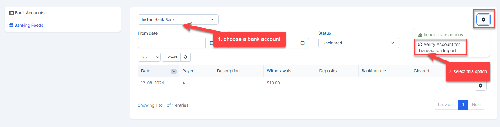 - In your system's left sidebar, go to Accounting → Banking→ Banking Feeds → select a back account → Click the settings icon at the top right corner and select Verify Account for Transaction Import.