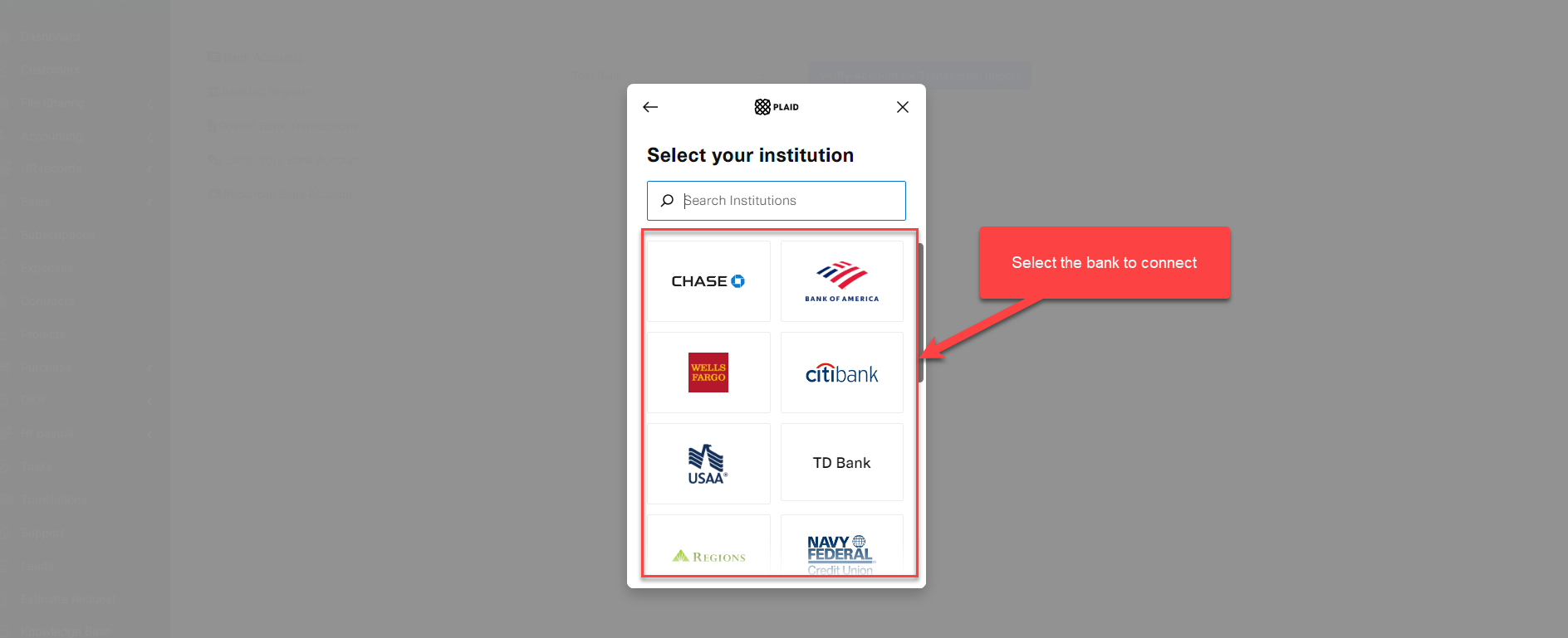 To integrate your bank account with the system using Plaid, follow these steps: