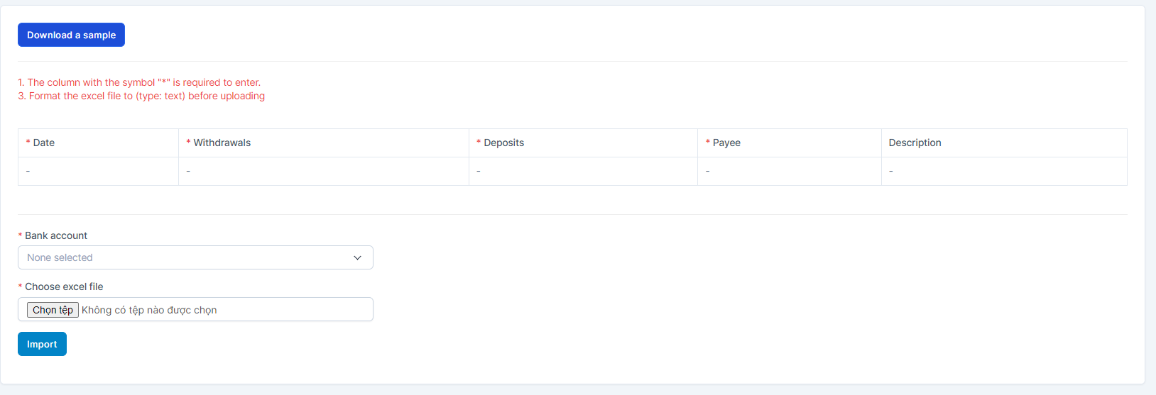 - Import transactions: Allows importing bank data via Excel or CSV files