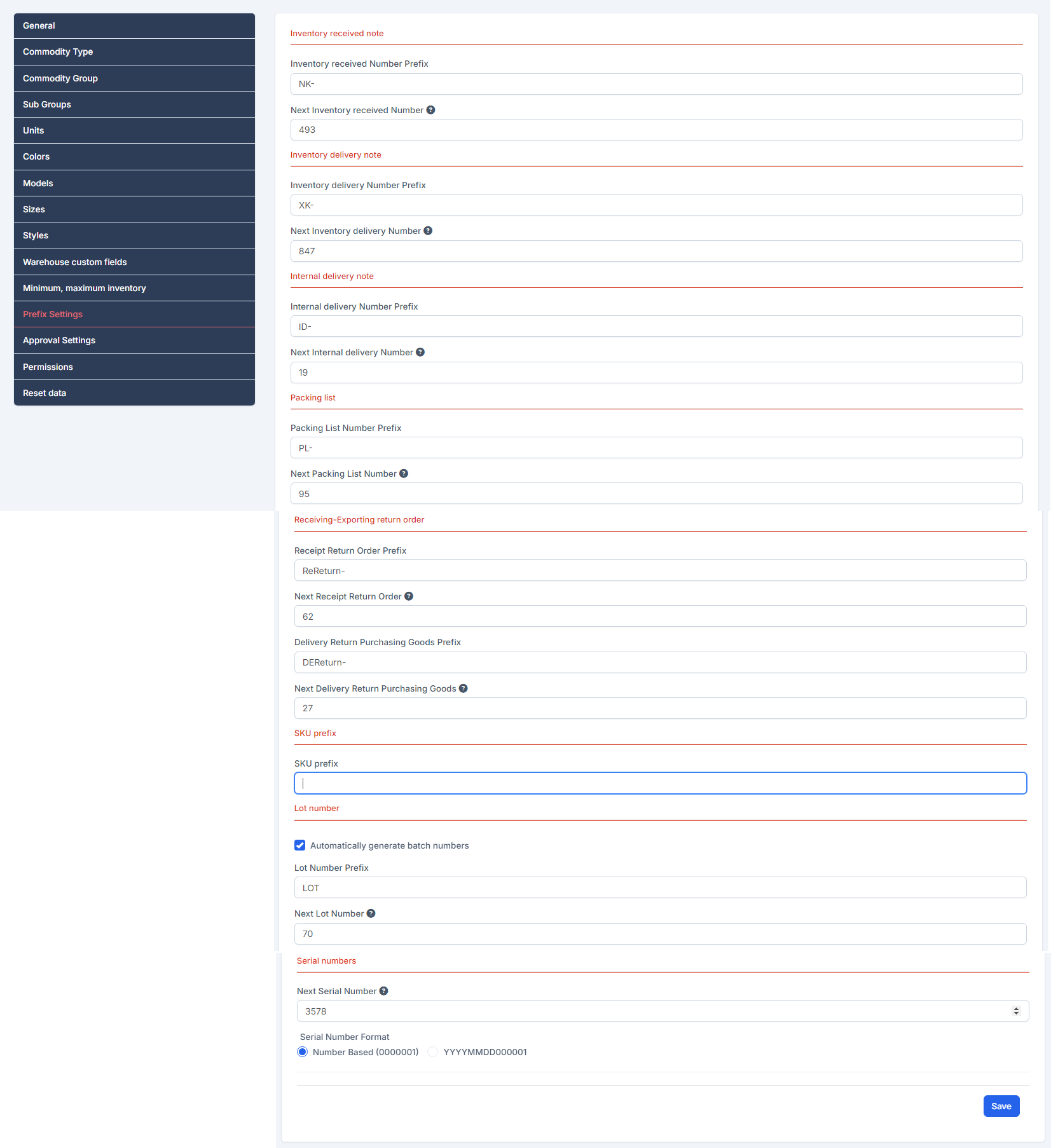- Lot Number Prefix: Prefix for lot number