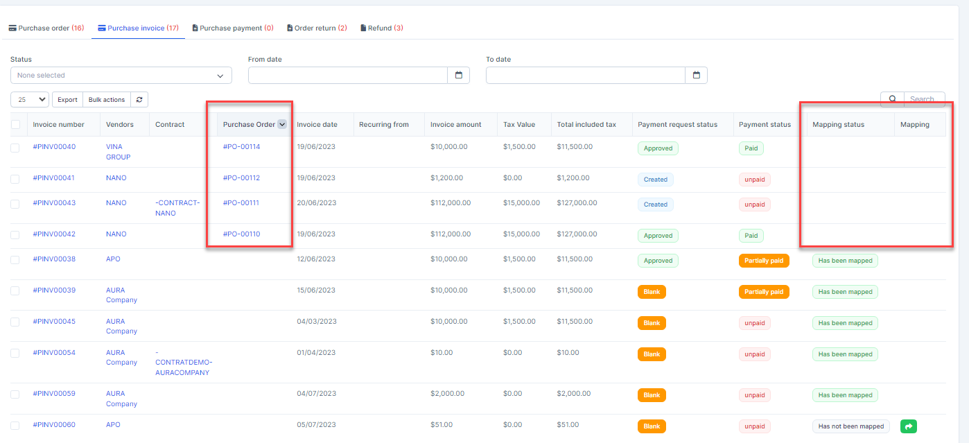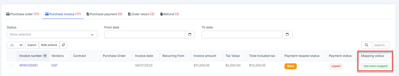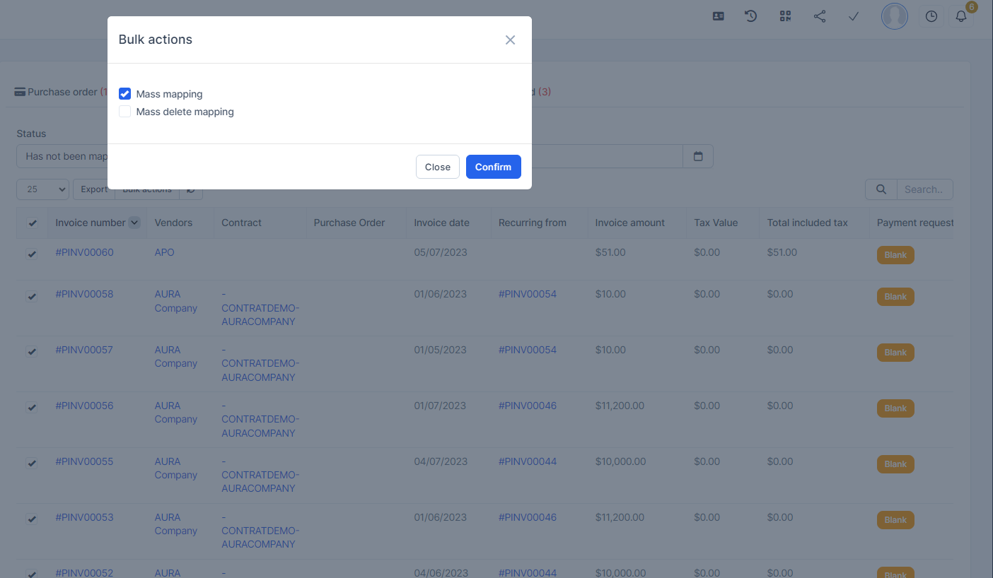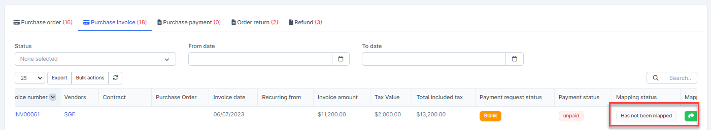 - Step 2. Go to the Transactions menu -> Purchase->Purchase invoice -> Select some purchase invoices which mapping status is Has not been mapped -> click on the Bulk actions -> select the Mass mapping -> click on the Confirm button.