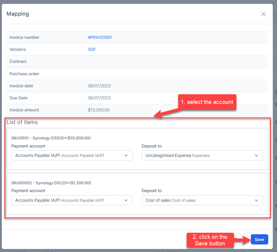 - Step 1. Enable the purchase invoice mapping setup and select the payment account and deposit to -> Click on the Save button
