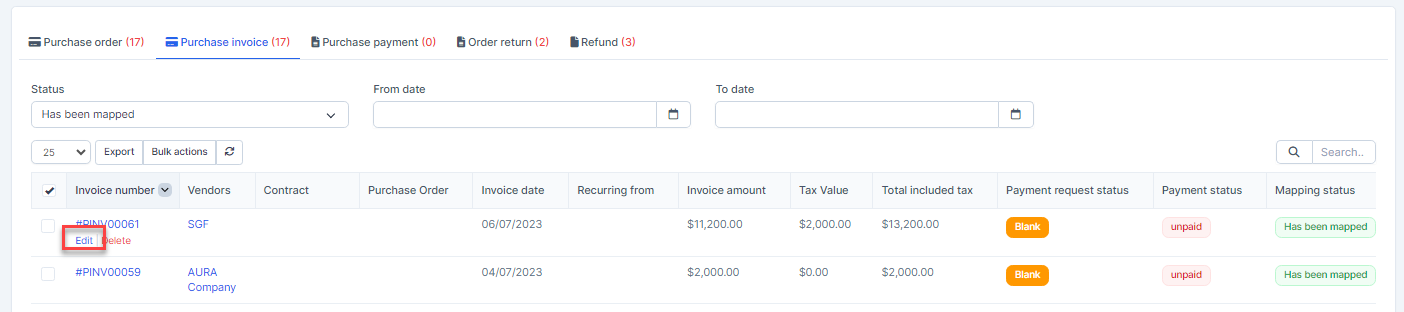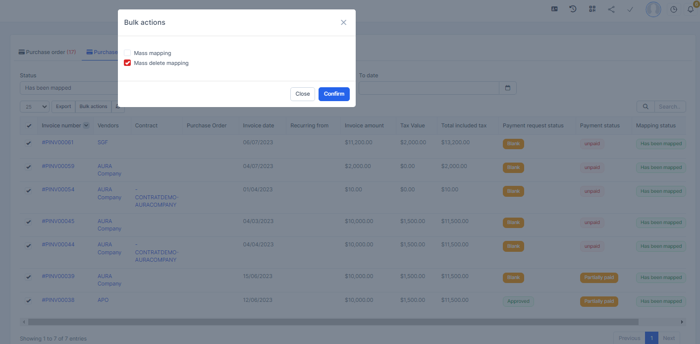 - Step 1. Go to the Transactions menu -> Purchase -> Purchase invoice -> Select the purchase invoice which mapping status is Has been mapped -> click on the Bulk actions -> select the Mass delete mapping -> click on the Confirm button