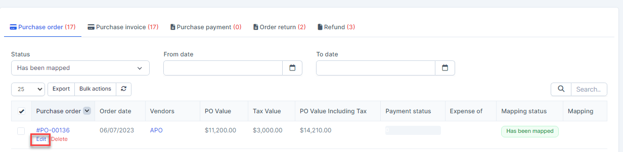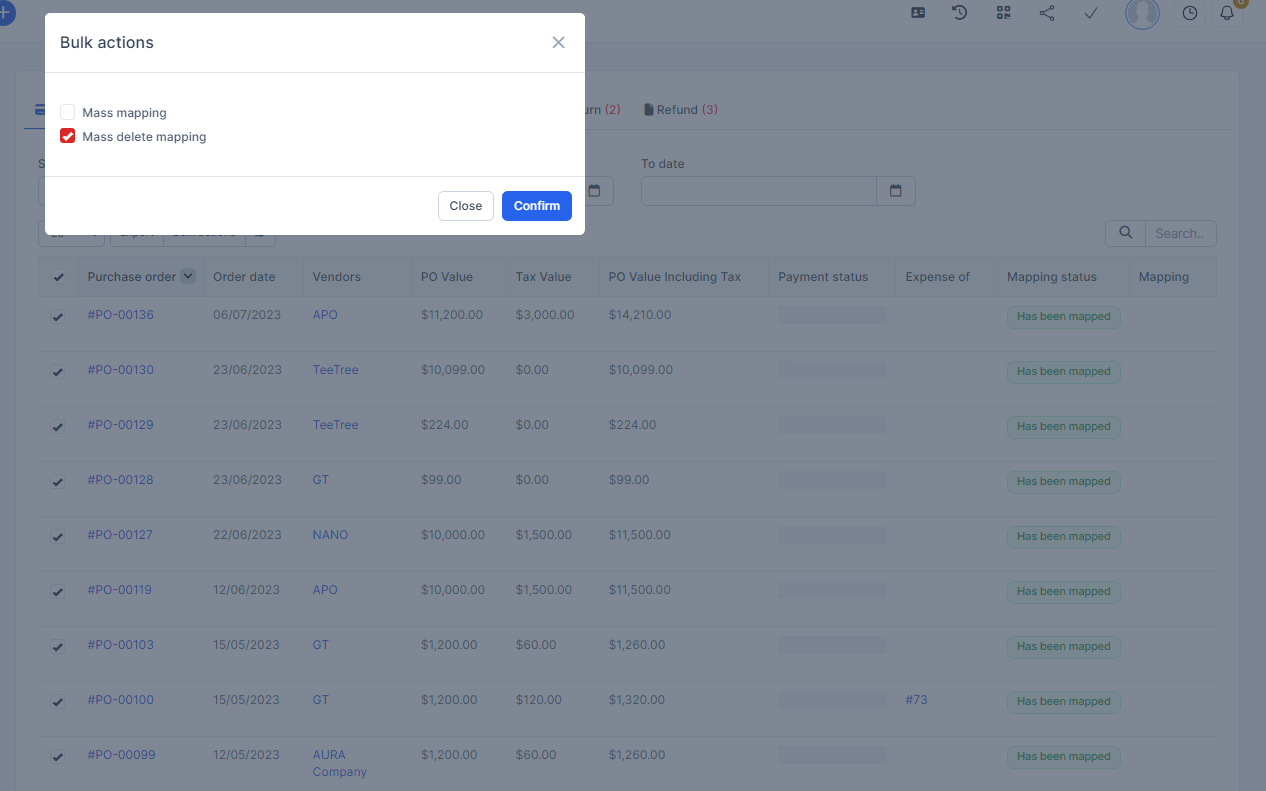 - Step 1. Go to the Transactions menu -> Purchase -> Purchase order-> Select the purchase order which mapping status is Has been mapped -> click on the Bulk actions -> select the Mass delete mapping -> click on the Confirm button