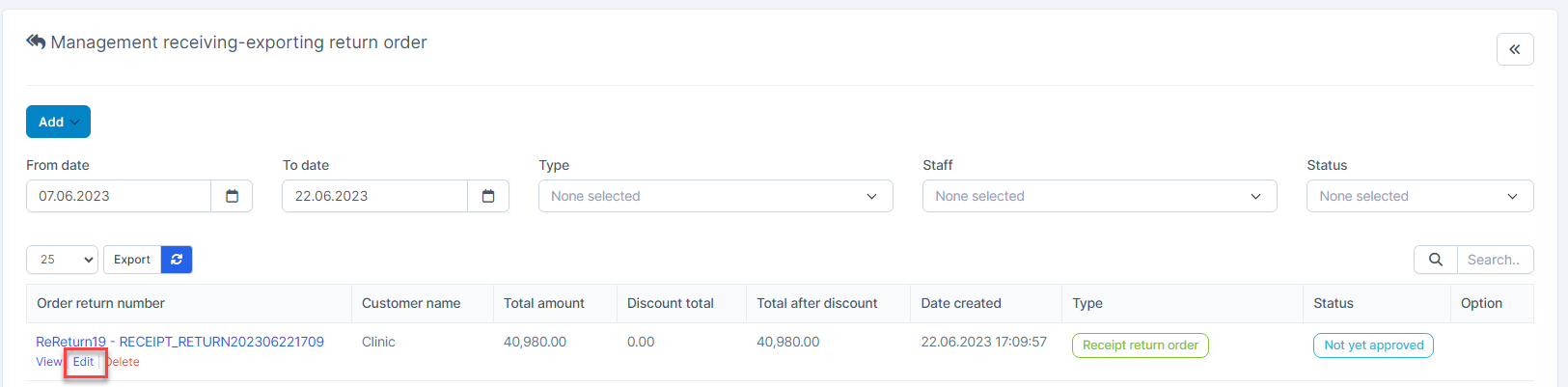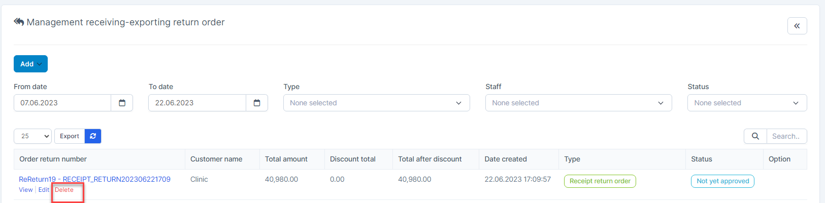 - Step 2. Go to Receiving-Exporting return order menu under Inventory module from the left sidebar -> click Add button -> Select Receipt return order