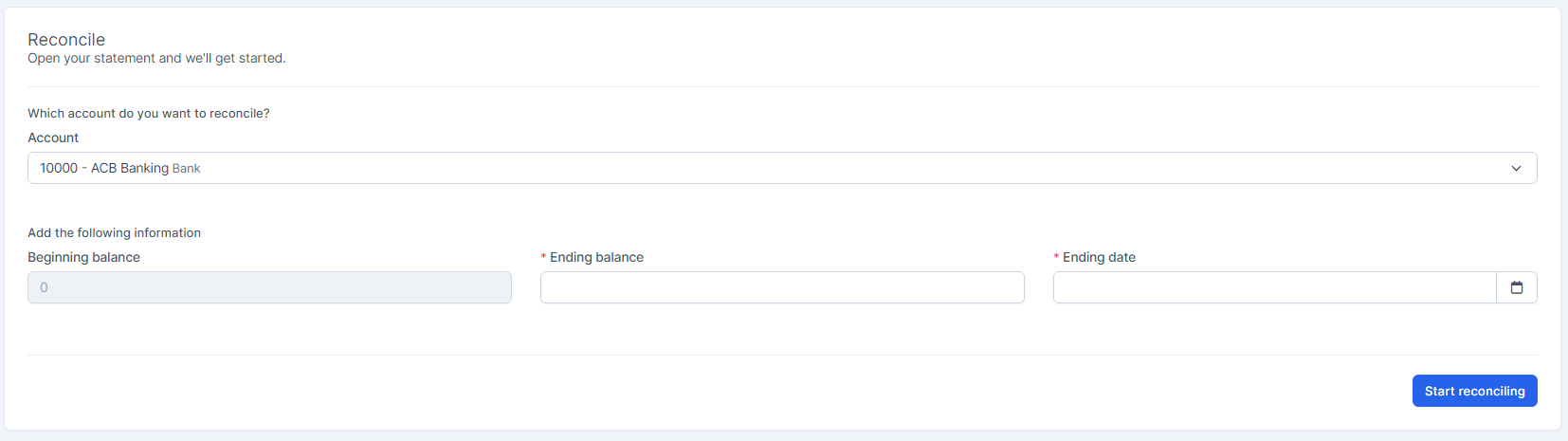 Step 2. From the Account dropdown, select the account you want to reconcile. -> Enter the Ending balance and Ending date
