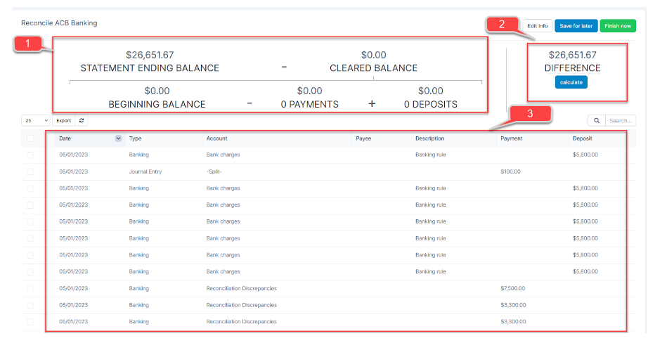 - 3rd position: List of transactions for reconciliation.