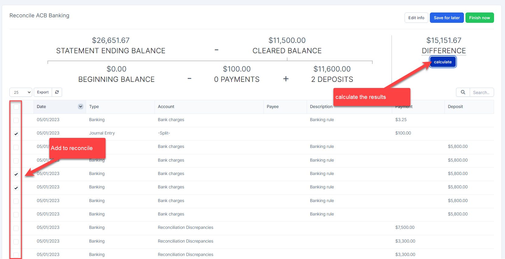 - Transactions related to this account and within the reconciliation period will be displayed.