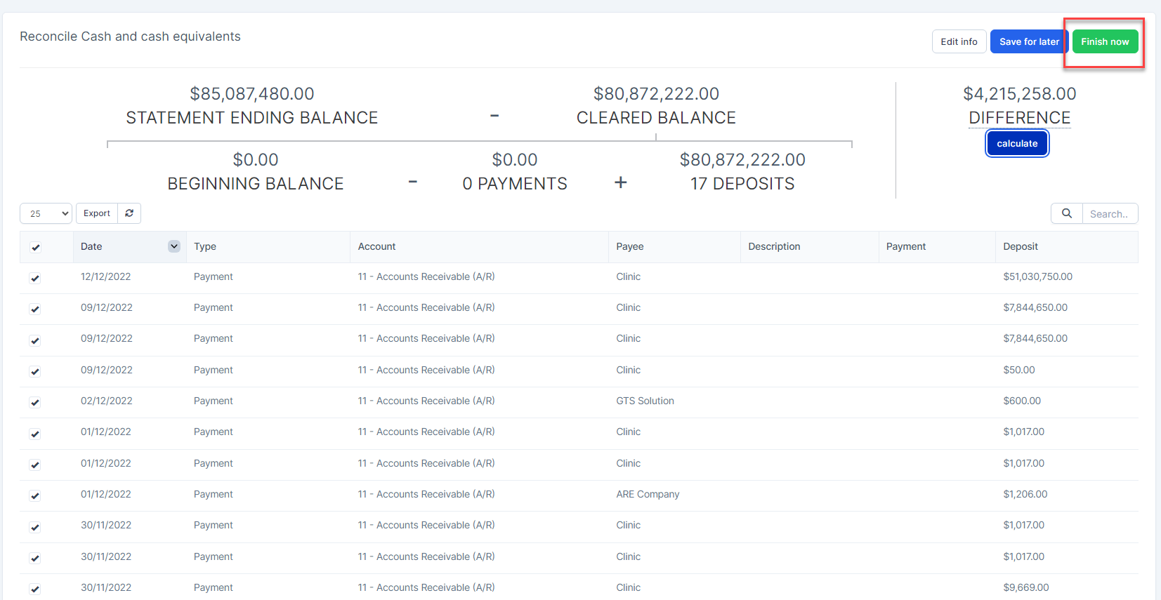 - Step 5. If you need to finish now when your difference isn't 0.00 yet -> click on the Finish now