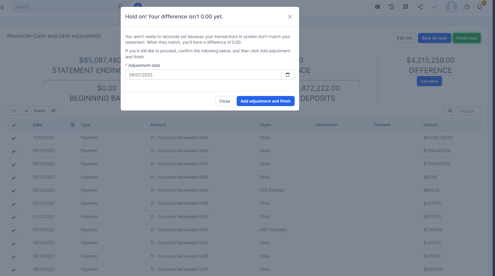 Finish now function: Used to complete this reconciliation, If the balance is zero, then clicking will complete this reconciliation. If it is not balanced, it will allow to make adjustments. When you select a date and create an adjustment, a double entry will be created to rebalance the amount to zero.