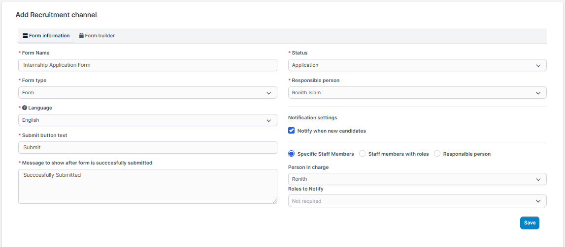 8. Check Notify when new candidates to send a notification to the Person In Charge, Staff members with roles or Responsible person.