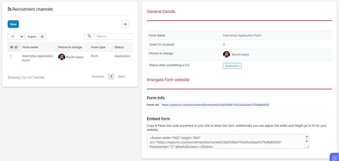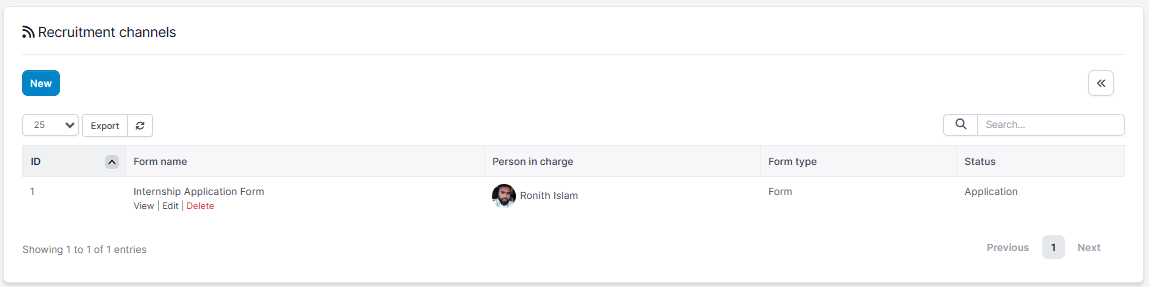 - Step 1. Go to Recruitment channels menu under Recruitment module from the left sidebar -> click New button.