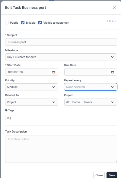 To create recurring task go to the Tasks menu in the admin area and click on the top left button New task