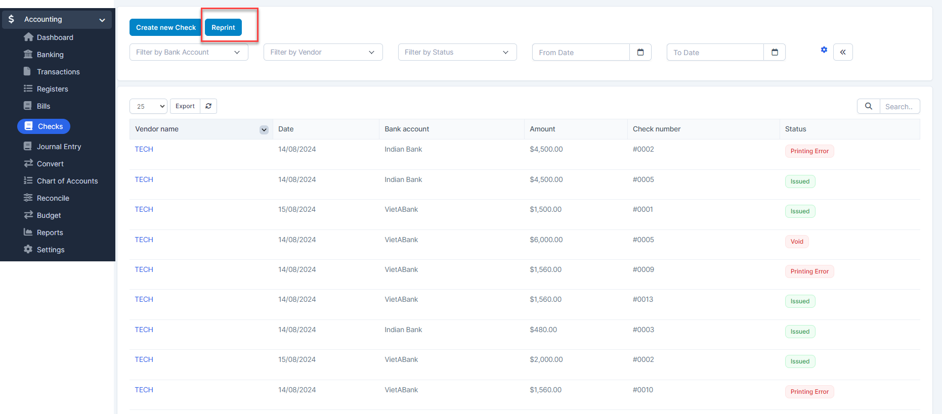 - Step 1: Go to Checks menu under the Accounting module -> Click Reprint