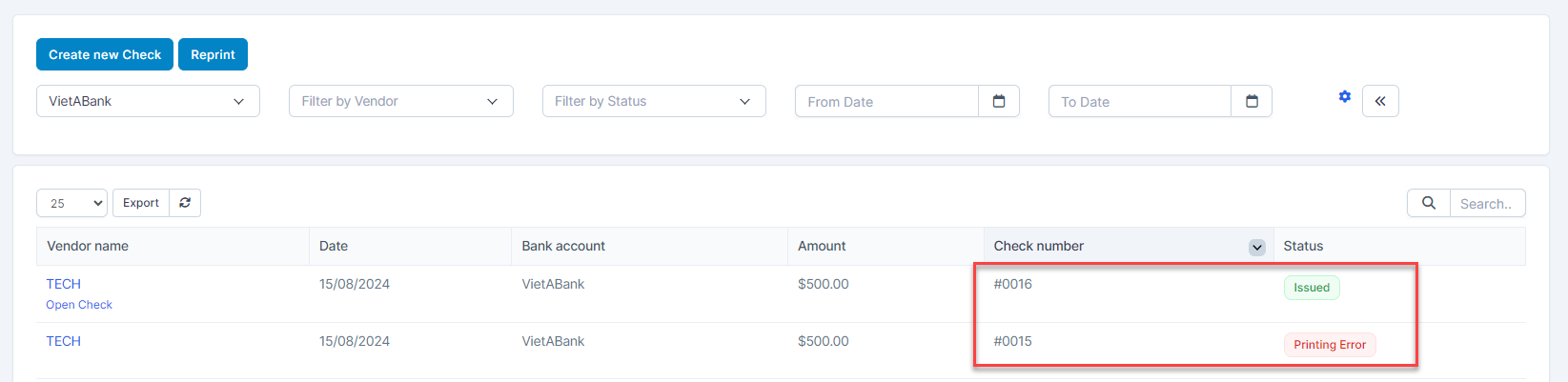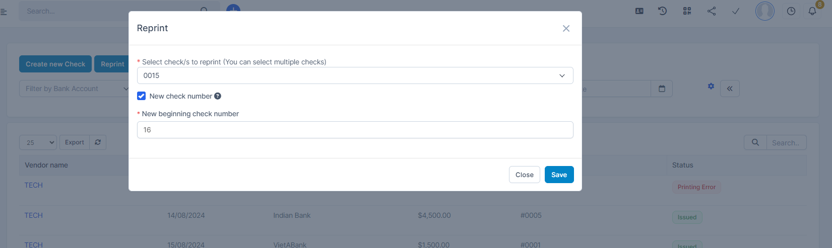 - New check number: if enabled, will reprint the check with the new check number. If disabled, New beginning check number field is hidden