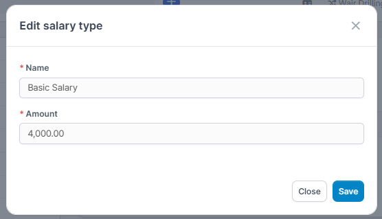 - Step 2: The system will display the screen Edit salary type -> Proceed to edit the data of the salary type -> Then click Save to save the operation or select Close to close the screen and cancel the operation just done.