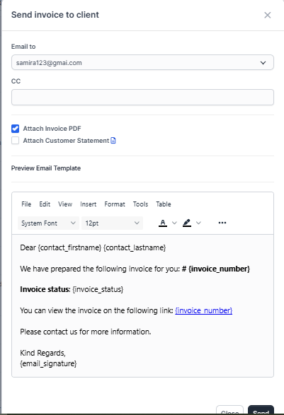 WPSCRM have the option to send this invoice to a customer which is related. Also, the PDF invoice will be attached to the email. If you want to do not attach the PDF invoice simple uncheck the checkbox Attach Invoice PDF