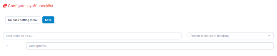- Step 3: After saving the data at the Add layoff checklist screen, the system will switch to another screen called Configure layoff checklist to perform more steps in the quit process. Select the function to add a step in the process (go to Step 4) or select the function to return to the main screen displaying the Layoff checklist list with the previously created data line.