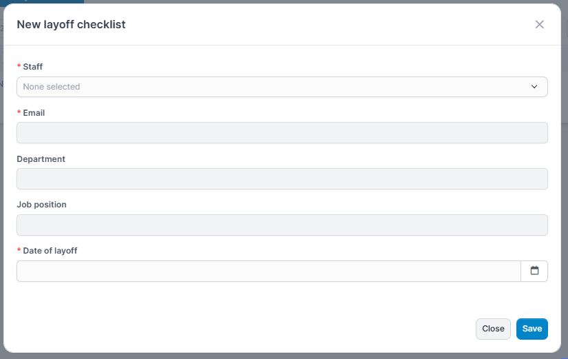 - Step 6: The system will display the New Layoff checklist screen -> Proceed to enter the necessary data -> Then click Save to save the operation or select Close to close the screen and cancel the action just done.