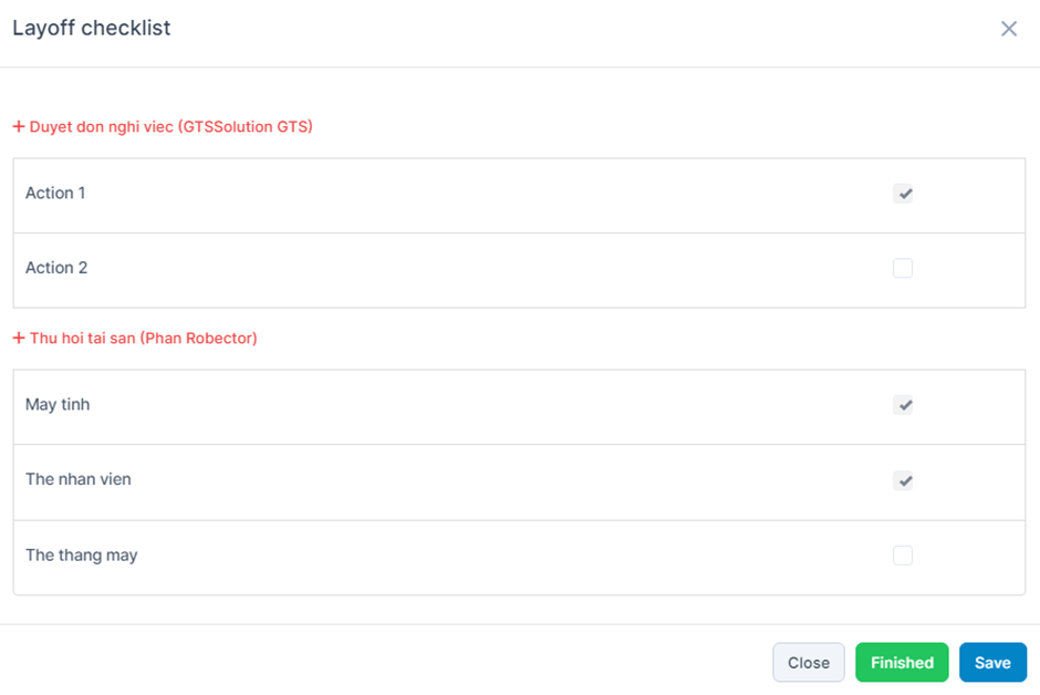 - Step 8: The system will display the Layoff checklist screen corresponding to the selected line -> Proceed to check the completed processes -> Then click Save to save the operation or select Close to close the screen and cancel the last action.
