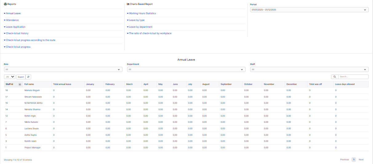 Report the number of annual leave days of employees by month in a period