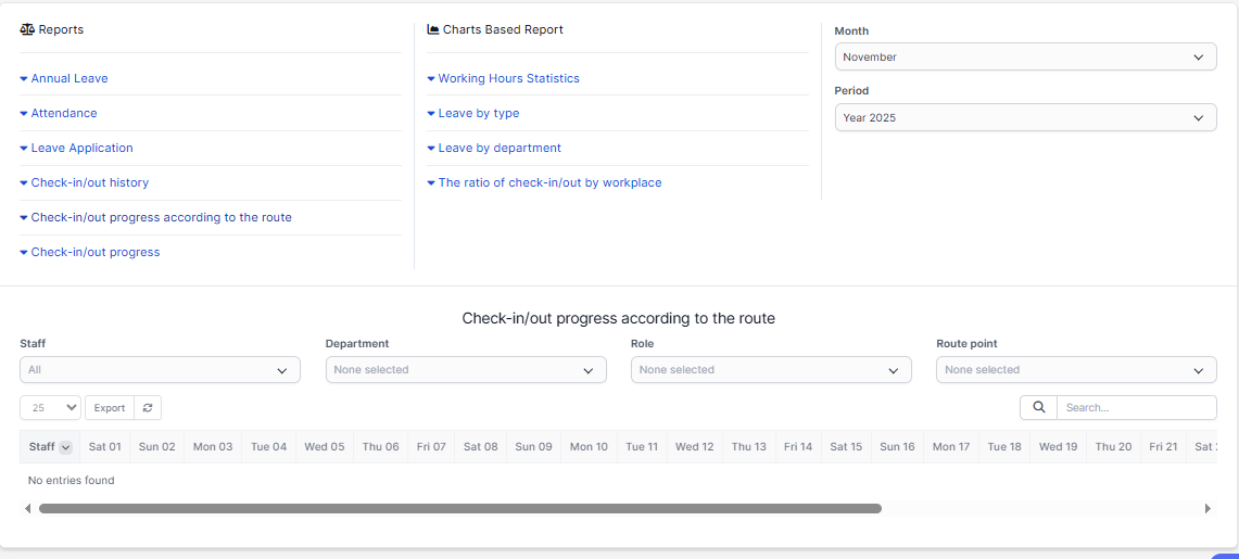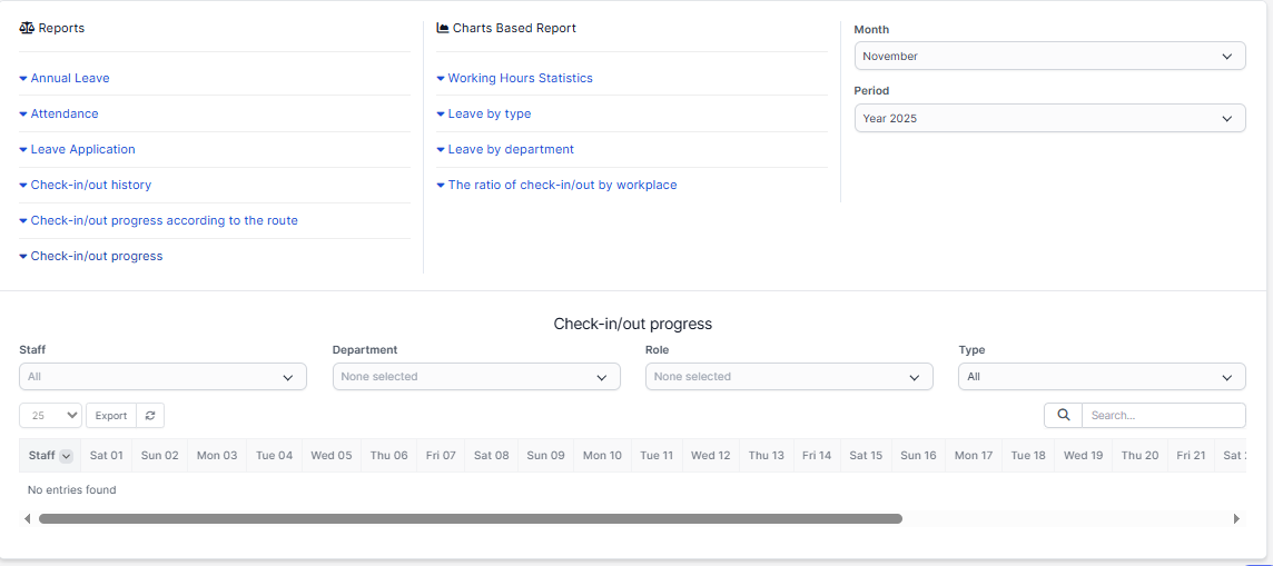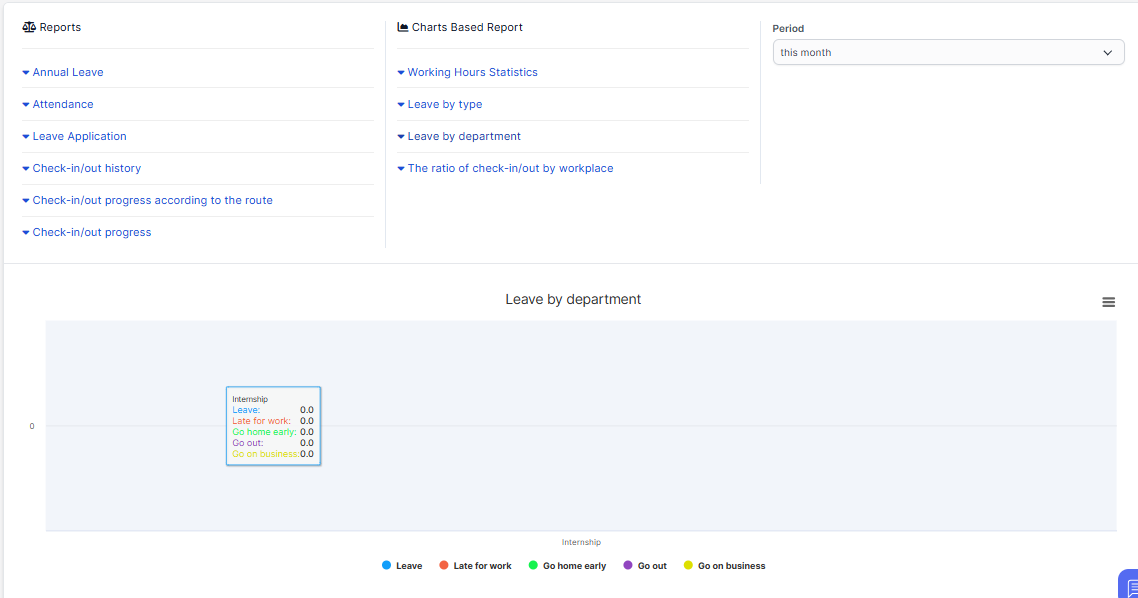 Statistics of leave days by department with: Leave, Late for work, Go home early, Go out, Go on business.
