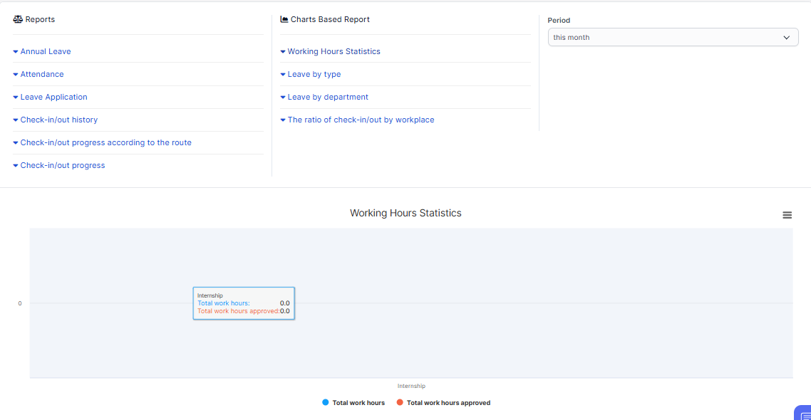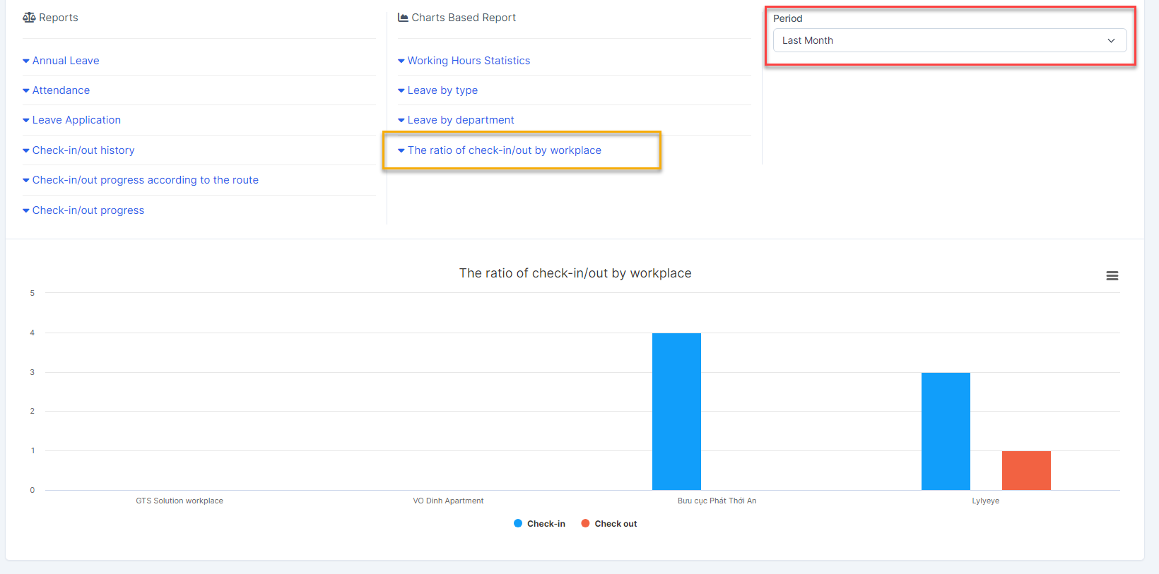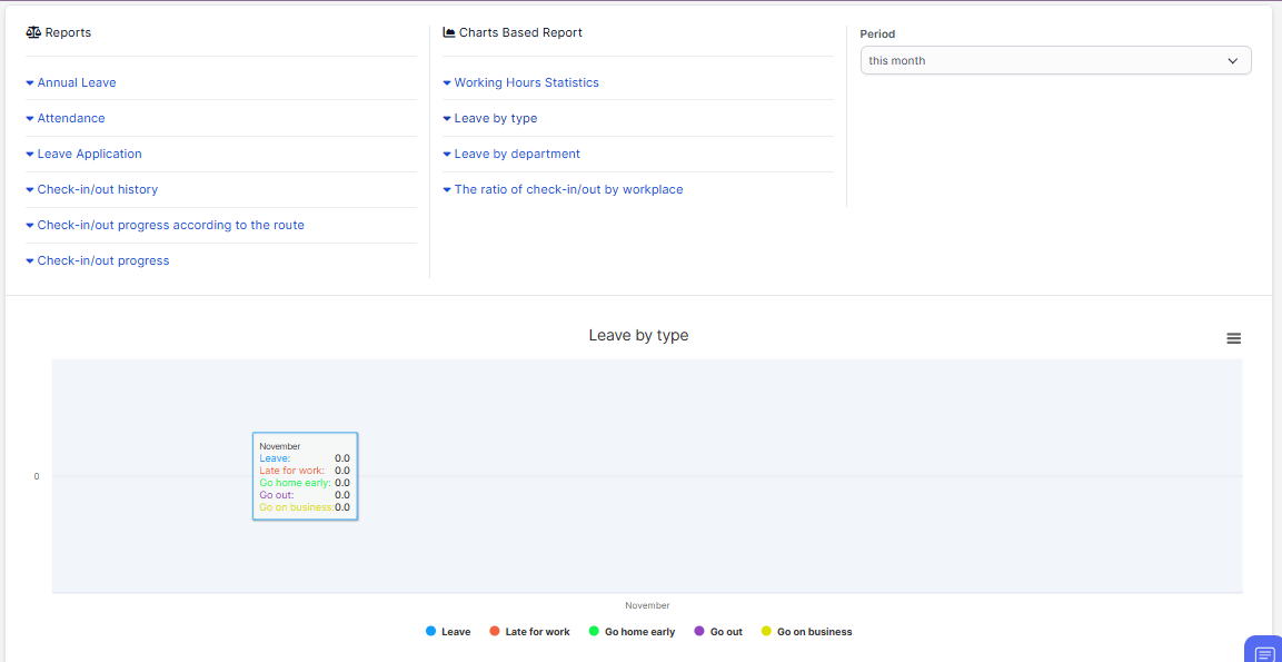 Statistics of leave days of all employees with: Leave, Late for work, Go home early, Go out, Go on business.