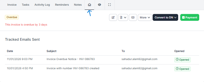 Let’s assume you sent an invoice to a contact and you want to see if the contact opened the email, in admin area open the invoice preview area and click on the envelope menu icon, there will be a list of all tracked emails sent with indicator does they are opened or not.