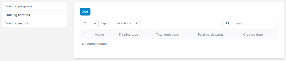 - Step 3: Go to the Training Libraries screen -> Select the Add function to create a set of questions in the question library