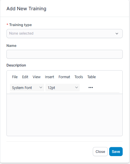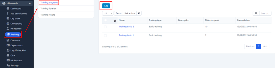 - Step 1: Select the HR Records module -> Settings -> Select the Type of trainings screen -> Select the Add function.