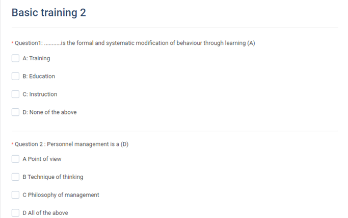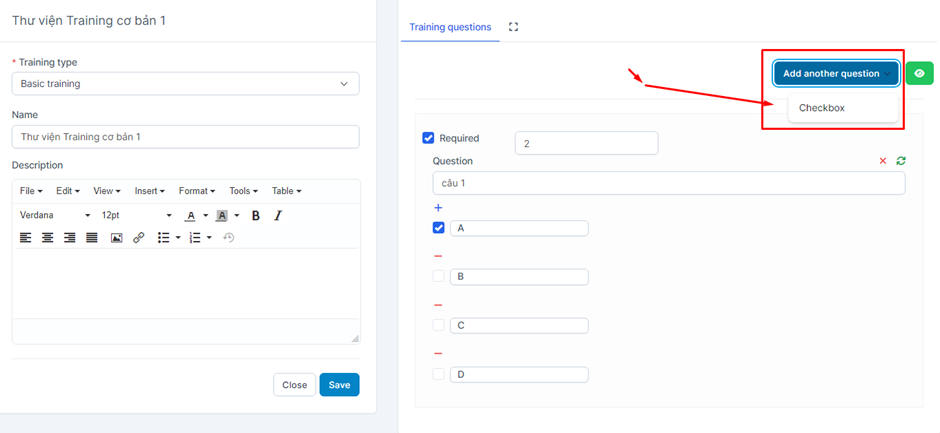 - Step 5: After successfully saving, the system will display the Training questions screen -> Select Add Another question -> Checkbox -> Enter data for the question.