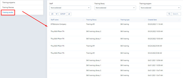 - - Step 9: Select the Training menu -> Select Training results -> When the employee completes the test, the results will be displayed on this screen.