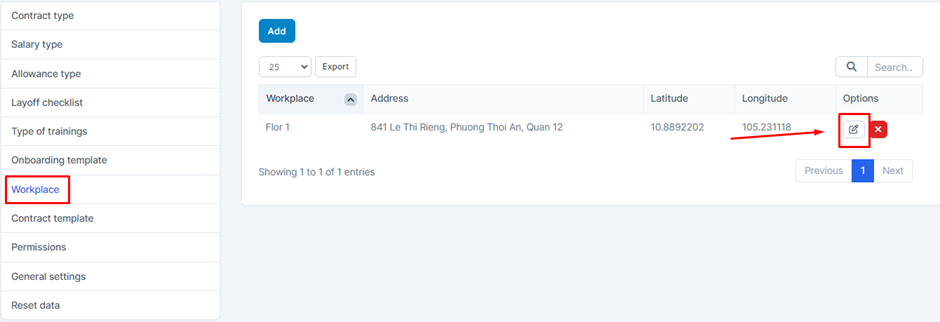 - Step 2: The system will display the screen Edit Workplace -> Proceed to edit the data of the Workplace -> Then click Save to save the operation or select Close to close the screen and cancel the operation just done